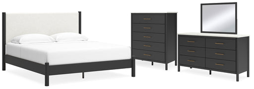 Cadmori King Upholstered Panel Bed with Mirrored Dresser, Chest and Nightstand