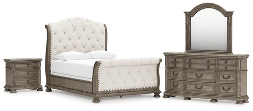 Ardenfield King Upholstered Sleigh Bed with Mirrored Dresser