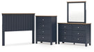 Details B414-87: Made with hardwood solids, mindi wood veneer and MDF substrates, Two-tone finish features a dark slate blue with a light brown wood-tone top, ¼" bolts (not included) are needed to attach headboard to your existing bed frame, Assembly required, B414B1: Includes dresser and mirror, Made with hardwood solids, mindi wood veneer and MDF substrates, Two-tone finish features a dark slate blue with light brown wood-tone top, Nickel-tone metal knobs, 6 drawers with fully finished interior, dovetail construction and heavy duty ball-bearing side glides, Mirror attaches to back of dresser, B414-45: Made with hardwood solids, mindi wood veneer and MDF substrates, Two-tone finish features a dark slate blue with a light brown wood-tone top, Nickel-tone metal knobs, 4 drawers with fully finished interior, dovetail construction and heavy duty ball-bearing side glides,