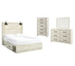 Details | B192-46: Made of engineered wood (MDF/particleboard) and decorative laminate, Wispy white finish over replicated oak grain with authentic touch, Large-scale hardware with dark finish, 5 smooth-gliding drawers, Drawer interiors are lined with a faux linen laminate for a clean, finished look, Safety is a top priority, clothing storage units are designed to meet the most current standard for stability, ASTM F 2057 (ASTM International), Drawers extend out to accommodate maximum access to drawer interior while maintaining safety, B192B1: Includes dresser with mirror, Made of engineered wood (MDF/particleboard) and decorative laminate, Wispy white finish over replicated oak grain with authentic touch, 6 smooth-gliding drawers, Drawer interiors are lined with a faux linen laminate for a clean, finished look, Large-scale hardware with dark finish, Mirror attaches to back of dresser, Assembly required, B192B17: Includes headboard, footboard, side storage, rail and slats, Made of engineered wood (MDF/particleboard) and decorative laminate, Wispy white finish over replicated oak grain with authentic touch, Large-scale hardware with dark finish, 2 decorative sconce lights, LED with 3 AA batteries, 2 smooth-gliding storage drawers, 2 storage cubbies, 2 slim-profile USB charging ports, Power cord included; UL-listed, Bed does not require additional foundation/box spring; accommodates most zero clearance adjustable bases with the addition of a bunkie board, Mattress available, sold separately, Assembly required, | |