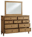 Details B895B2: Includes upholstered panel headboard, footboard, rails and slats, Made with hardwood solids, hickory veneer and MDF substrates, Light brown wood-tone finish, Polyester upholstery, Foundation/box spring required, sold separately, Mattress available, sold separately, Assembly required, B895B1: Includes dresser and mirror, Made with hardwood solids, hickory wood veneer and MDF substrates, Light brown wood-tone finish, Dark bronze-tone drawer pulls, 9 drawers with fully finished interior, dovetail construction and heavy duty ball-bearing side glides (top drawers felt lined), Mirror attaches to back of dresser, B895-46: Made with hardwood solids, hickory wood veneer and MDF substrates, Light brown wood-tone finish, Dark bronze-tone drawer pulls, 6 drawers with fully finished interior, dovetail construction and heavy duty ball-bearing side glides (top drawers felt lined),