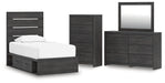 | Details | PCB2108B17: Includes panel headboard/footboard, rails with side storage and roll slats, Made with engineered wood (MDF/particleboard/plywood) and decorative laminate for the right balance of affordability and durability , Charcoal finish over replicated oak grain with authentic touch, Decorative laminate replicates natural or man-made material surfaces with consistent color, pattern and texture, 2 smooth-gliding drawers, 2 storage cubbies, Bed does not require additional foundation/box spring; accommodates most zero clearance adjustable bases with the addition of a bunkie board, Mattress available, sold separately, Minor assembly required, PCB2108B1: Includes dresser and mirror, Made with engineered wood (MDF/particleboard/plywood) and decorative laminate for the right balance of affordability and durability , Charcoal finish over replicated oak grain with authentic touch, Decorative laminate replicates natural or man-made material surfaces with consistent color, pattern and texture, Large-scale dark colored handles, 6 smooth-gliding drawers, Drawer interiors are lined with a faux linen laminate for a clean, finished look , Mirror attaches to back of dresser; can also be mounted on wall horizontally or vertically, Safety is a top priority, clothing storage units are designed to meet the most current standard for stability, ASTM F 2057 (ASTM International), Drawers extend out to accommodate maximum access to drawer interior while maintaining safety, Minor assembly required, PCB2108-46: Made with engineered wood (MDF/particleboard/plywood) and decorative laminate for the right balance of affordability and durability, Charcoal finish over replicated oak grain with authentic touch, Decorative laminate replicates natural or man-made material surfaces with consistent color, pattern and texture, Large-scale dark colored handles, 5 smooth-gliding drawers, Drawer interiors are lined with a faux linen laminate for a clean, finished look, Safety is a top priority, clothing storage units are designed to meet the most current standard for stability, ASTM F 2057 (ASTM International), Drawers extend out to accommodate maximum access to drawer interior while maintaining safety, Minor assembly required, | |