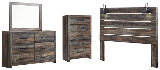 Drystan King Panel Bed with 2 Storage Drawers with Mirrored Dresser and Chest