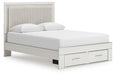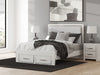 Details Includes upholstered panel headboard, storage footboard, roll slats and platform rails , Made with engineered wood (MDF/particleboard/plywood) and decorative laminate for the right balance of affordability and durability , Matte white finish with subtle replicated wood grain, Decorative laminate replicates natural or man-made material surfaces with consistent color, pattern and texture , Polyester upholstery , Chrome-tone and glitter accents, Large-scale chrome-tone handles with faceted details, 2 smooth-gliding drawers , Drawer interiors are lined with a faux linen laminate for a clean, finished look , Bed does not require additional foundation/box spring; accommodates most zero clearance adjustable bases with the addition of a bunkie board, Mattress available, sold separately, Minor assembly required
