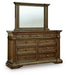 Details Includes dresser and mirror, Dresser made with hardwood solids, birch veneer and MDF substrate; mirror made with solid wood, Multi-step brown finish using stains and glaze with hand-rubbed details, Large metal oval knobs with antiqued brass-tone finish, 9 smooth-gliding drawers with fully finished interiors, dovetail construction and heavy-duty ball-bearing side glides, Top drawers felt lined, Mirror attaches to back of dresser