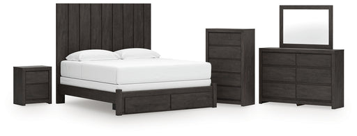 Graystorm King Panel Bed with Mirrored Dresser, Chest and Nightstand