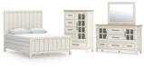 This bedroom set elevates the art of modern farmhouse design. Its two-tone aesthetic blends antiqued white and light grayish brown for added charm. Framed drawer fronts and dark rustic bar pulls lend a country feel. Conveying a feeling of relaxed comfort, this set is sure to carry you away to a dreamy time and place.
