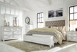 Give your retreat vintage charm with this bedroom set in a beautifully distressed whitewash finish. You'll love the headboard's grand style featuring a picture framed panel. The bench footboard is equally elegant offering extra storage and a convenient seat. Generously scaled moulding, framed drawer fronts and bun feet enhance the character of this bedroom set—evoking the feel of a quaint cottage escape.