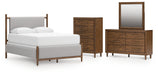 Details B615B2: Includes upholstered panel headboard and footboard , Solid wood frame, Due to the use of natural wood materials, some variations may occur , Frame with medium brown wood tone finish, Polyester upholstery, Tapered legs, Foundation/box spring required, sold separately , Mattress available, sold separately, Assembly required, B615B1: Includes dresser and mirror, Made with hardwood solids, mango wood veneer and MDF substrates, Medium brown wood-tone finish, 6 drawers with fully finished interior, dovetail construction and heavy duty ball-bearing side glides, Round tapered legs, Mirror attaches to back of dresser, B615-46: Made with hardwood solids, mango wood veneer and MDF substrates, Medium brown wood-tone finish, 5 drawers with fully finished interior, dovetail construction and heavy duty ball-bearing side glides, Round tapered legs,