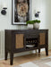 | Details | Made with hardwood solids and thick rustic oak veneer, Aged black finish with rubbed-through edges, Synthetic cane door accents, 2 cabinets; 1 adjustable shelf behind each door, Center drawer with fully finished interior, felt-lined bottom and ball-bearing side glides, Reversible wine rack shelf | |