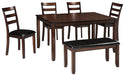 | Details | Includes table, 4 upholstered chairs and upholstered bench, Table made of veneers, wood and engineered wood, Wood frame chairs and bench, Cushioned seats with faux leather upholstery, Seats 6, Assembly required, Expert assembly recommended; available at check out for an additional fee | |
