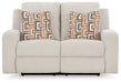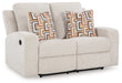 This reclining loveseat invites you to a luxuriously soft lounging experience. The chic hue fits right in with contemporary color palettes. A tufted back keeps the look right on trend. Balancing style and function, its pull tab reclining effortlessly takes you to relaxation mode.