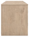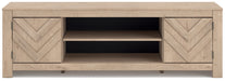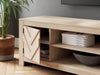 This TV stand embraces a classically charming aesthetic and repurposes it for modern living. Its light replicated wood grain appeals to your love of vintage character, while the chic chevron pattern is effortlessly on trend. And with hidden storage behind the doors, your media accessories stay tucked away in style.