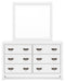 | Details | B427B8: Includes king panel headboard, footboard, rails and slats, Made with hardwood solids, okoume veneer and MDF substrates, White finish, Foundation/box spring required, sold separately, Mattress available, sold separately, Assembly required, B427B1: Includes dresser and mirror, Made with hardwood solids, okoume veneer and MDF substrates, White finish, 6 drawers with dovetail construction and metal center guides, Hardware with dark finish, Drawer interiors are lined with a wood grain laminate for a clean, finished look, Mirror attaches to back of dresser, B427-92: Made with hardwood solids, okoume veneer and MDF substrates, White finish, 2 drawers with dovetail construction and metal center guides, Hardware with dark finish, Drawer interiors are lined with a clean wood grain laminate for a clean, finished look, | |