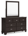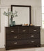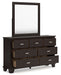 | Details | B441B6: Includes panel headboard, footboard, rails and slats, Made with hardwood solids, engineered wood veneer and MDF substrates, Dark brown finish, Floating panel headboard, Picture frame footboard, Foundation/box spring required, sold separately , Mattress available, sold separately, Assembly required, B441B1: Includes dresser and mirror, Made with hardwood solids, engineered wood veneer and MDF substrates, Dark brown finish, Metal bar pulls with bright nickel-tone finish, 7 smooth-gliding drawers with dovetail construction and metal center guides, Drawer interiors are lined with a wood grain laminate for a clean, finished look, Top moulding on dresser, Mirror attaches to back of dresser, | |