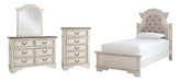 | Details | B743B12: Made of veneers, wood and engineered wood, with cast resin components, Antiqued two-tone finish, 6 smooth-gliding drawers with dovetail construction, Dark bronze-tone hardware, Mirror attaches to back of dresser, Assembly required, Includes tipover restraint device, B743B13: Made of veneers, wood and engineered wood, with cast resin components, Includes upholstered headboard, footboard and rails, Distressed, chipped white finish, Upholstered headboard with foam cushion, button tufting, Assembly required, Mattress and foundation/box spring available, sold separately, Bed is compatible with an adjustable base, B743-45: Made of veneers, wood and engineered wood, with cast resin components, Antiqued two-tone finish, 5 smooth-gliding drawers with dovetail construction (top drawer felt lined), Dark bronze-tone hardware, | |