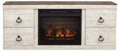 | Details | Includes TV stand and electric fireplace insert (W100-101), Made with engineered wood (MDF/particleboard) and decorative laminate, Replicated white wash worn through paint; TV stand top with replicated wood grained block pattern with an authentic touch, Antiqued brass-tone ring pulls, TV stand with open storage area and 2 single-door storage areas (each with adjustable/removable shelf), Cutouts for wire management and ventilation, Electric fireplace insert provides up to 5,386 BTU/1,500W and warms up to 1,000 square feet (heats larger rooms), 7-level temperature setting; 5 levels of flame brightness, LED-lit multi flame display operates with or without infrared heat; realistic-looking log set with dynamic glowing embers, Remote control with LED display, Timer function with programmable ranges from 10 minutes to 9 hours; overheating control device, Power cord included; UL Listed, Assembly required; simply remove the center shelf and back panel to make room for the fireplace insert | |
